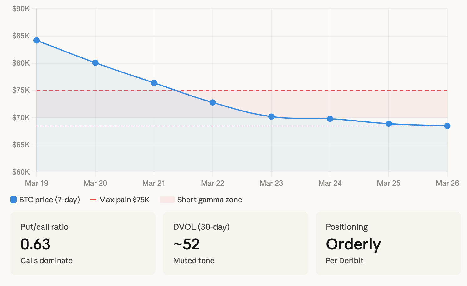 Market makers are currently positioned in a corridor of short gamma — concentrated between $70,000 and $75,000.
